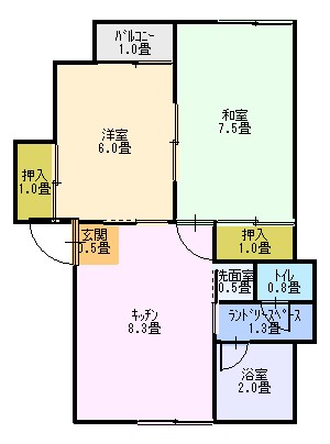 | 間取り | 2DK (和室:6畳) (洋室:6) B・T別室/水洗トイレ/洗濯機置場/ユニットバス/給湯/シャワー |