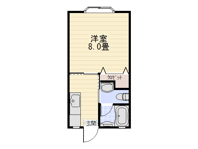 | 間取り | 1DK (洋室:8) B・T別室/水洗トイレ/洗濯機置場/ユニットバス/給湯/シャワー/エアコン |