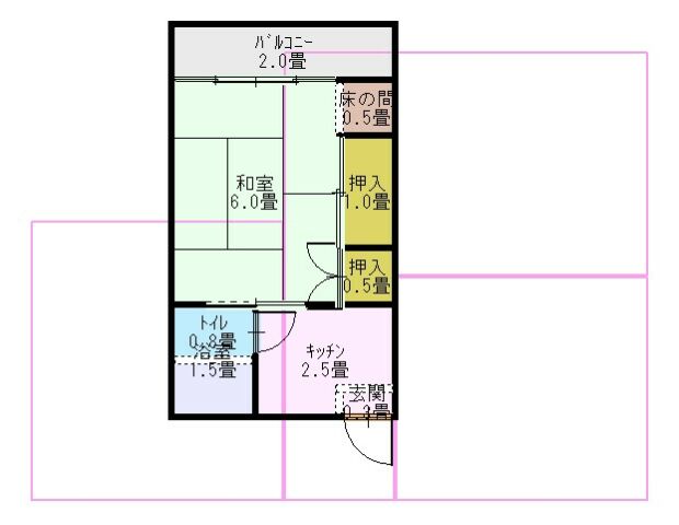 | 間取り | 1DK (和室:6畳) B・T同室/水洗トイレ/洗濯機置場/ユニットバス/給湯/シャワー |