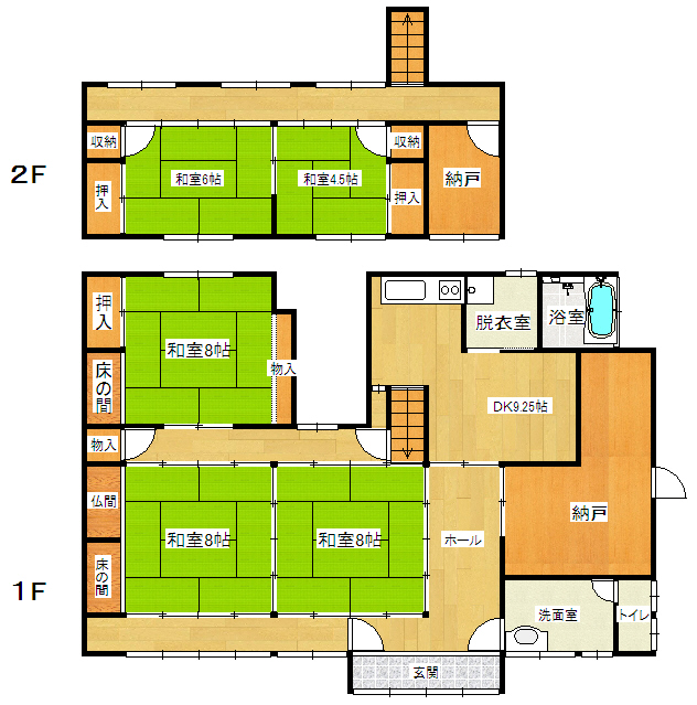 | 間取り | 5DK (和室:8畳、8畳、8畳、6畳、4.5畳) DK9.25 納戸 |
