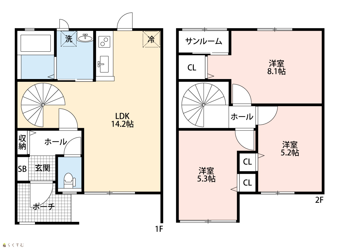 | 間取り | 3LDK (洋室:8.1、5.3、5.2) LDK14.2 ※洋8.1帖にサンルーム部分も含まれます。 |