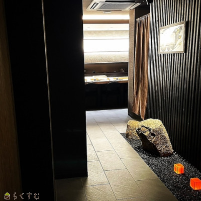 居抜き飲食店(寿司屋)、設備については引続き使用可(性能保証なし)、落ち着いた雰囲気の内装、高級感のある店内、店内に箱庭あり。