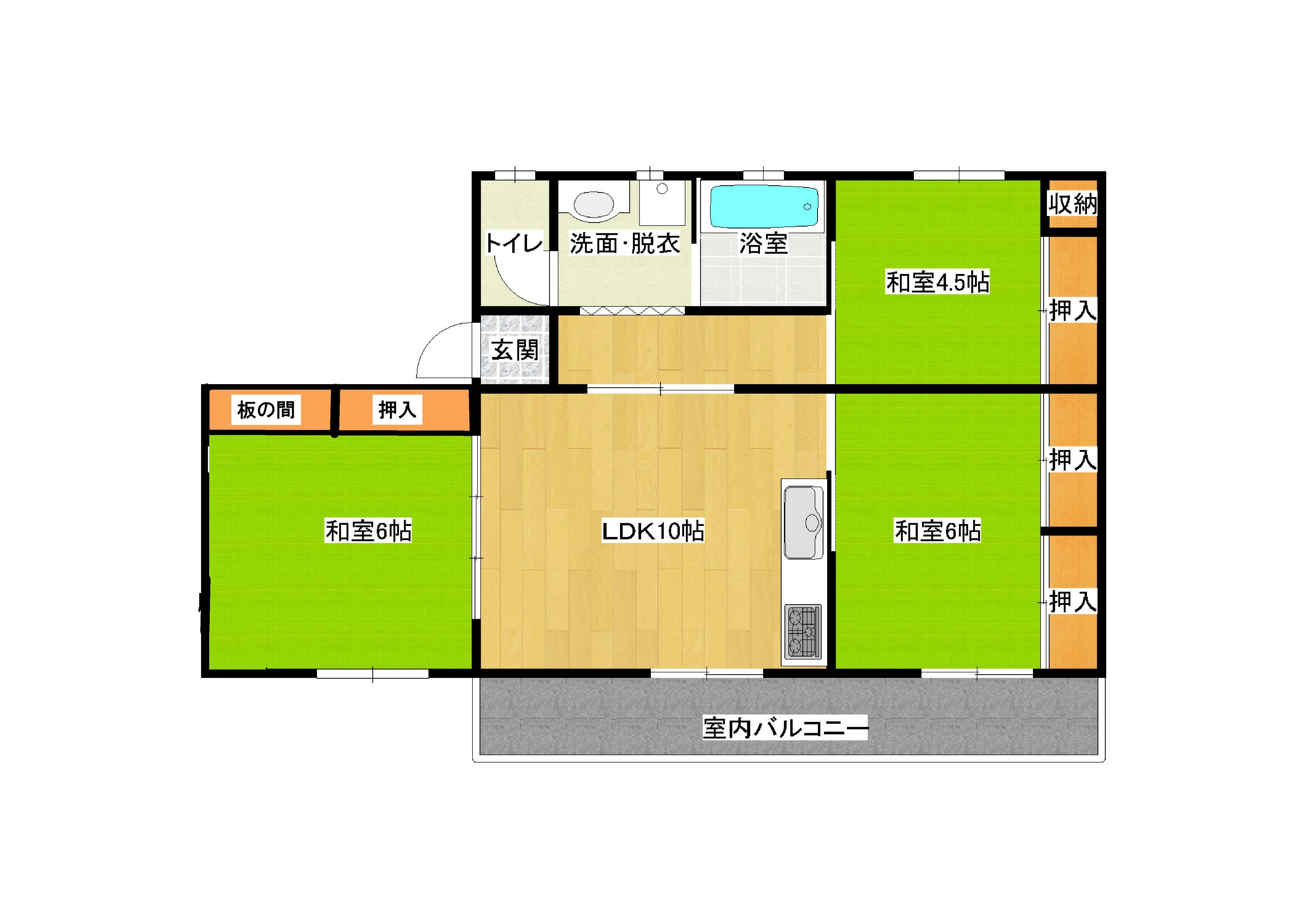 | 間取り | 3LDK (和室:6畳、6畳、4.5畳) LDK約10帖 ●4階建、4戸の2階部 ●室内サンルーム有 ●石油ファンヒーター完備 |
