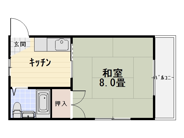 | 間取り | 1DK (和室:8畳) DK 水洗トイレ/洗濯機置場/ユニットバス/給湯/シャワー |
