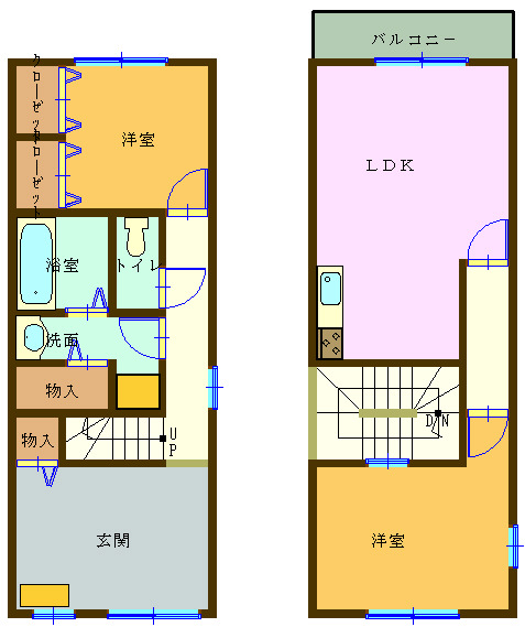 | 設備 | 敷地内ゴミ置き場、2階リビング、メゾネット、駐輪場あり、駐車場1台無料、駐車場2台無料、ディンプルキー、ダブルロックキー、2口コンロ、ガスコンロ 設置済み、バストイレ別、追いだき機能付き、ユニットバス、温水洗浄便座、シャワー付き洗面台、エアコン、都市ガス、公営水道、下水、バルコニー、全居室フローリング、洗濯機置場 室内、玄関収納、クロゼット、シューズBOX、BS端子・アンテナ、TVモニター付きインターホン、各居室照明、ペット相談可、保証会社要加入、メゾネット式 | ||