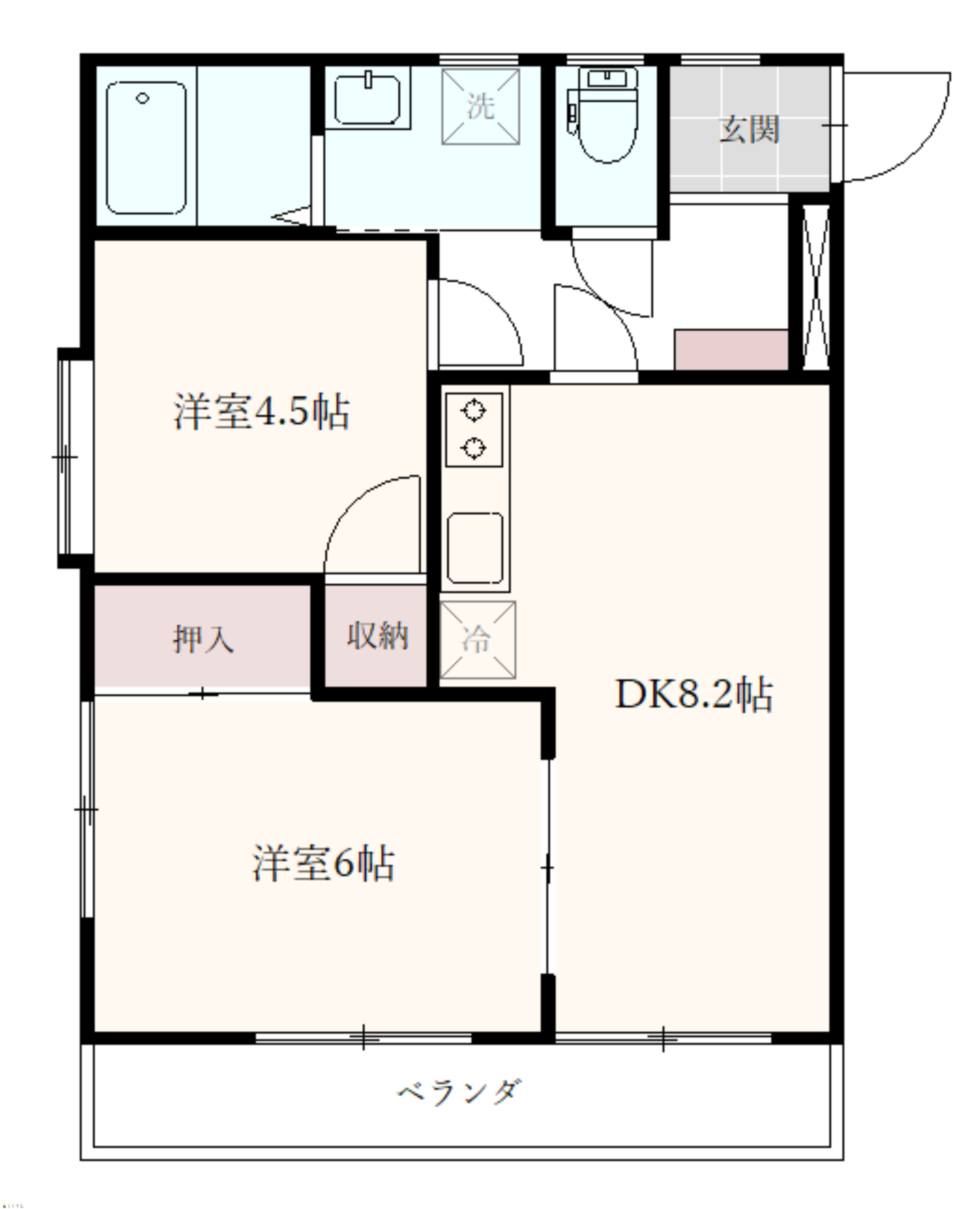 | 間取り | 2DK (洋室:6、4.5) DK8.2 洗面室、浴室、トイレ |