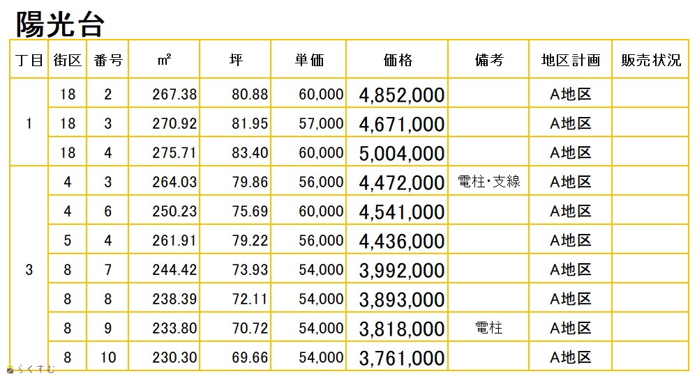 | 備考 | 上水道・下水道・都市ガス 引込済み。 【長岡ニュータウン 陽光台】 区画1-18-2 267.38㎡ 80.88坪 485.2万円 区画1-18-3 270.92㎡ 81.95坪 467.1万円 区画1-18-4 275.71㎡ 83.40坪 500.4万円 区画3-4-3 264.03㎡ 79.86坪 447.2万円 区画3-4-6 250.23㎡ 75.69坪 454.1万円 区画3-5-4 261.91㎡ 79.22坪 443.6万円 区画3-8-7 244.42㎡ 73.93坪 399.2万円 区画3-8-8 238.39㎡ 72.11坪 389.3万円 区画3-8-9 233.80㎡ 70.72坪 381.8万円 区画3-8-10 230.30㎡ 69.66坪 376.1万円 区画4-4-17 224.06㎡ 67.77坪 508.2万円 最新の販売状況・詳細は弊社ホームページ・電話・メールでお問い合わせください。 |