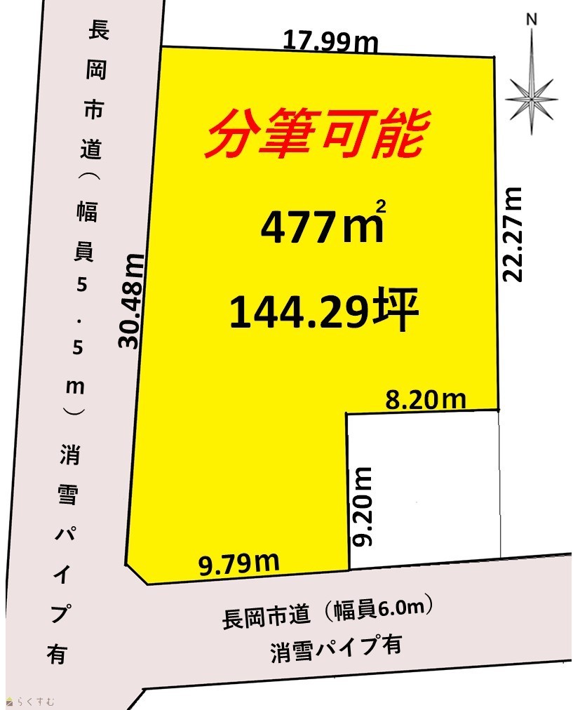 | 設備 | 角地、前道6m以上、南側道路面す、更地、学校近く、スーパー近く、閑静な住宅街、分割可能、建築条件なし、所有権、即引き渡し可、都市ガス(前面道路)、上水道(前面道路)、下水道(前面道路)、前面道路融雪設備あり | ||