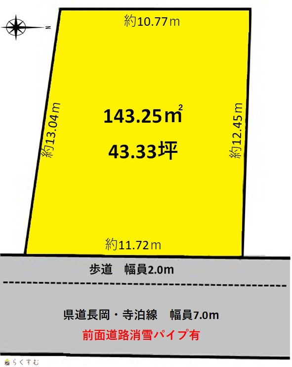 | 形状 | 間口 11.7m × 奥行 12.4m | 道路 | 県道長岡・寺泊線 幅員7.0m 消雪パイプあり |