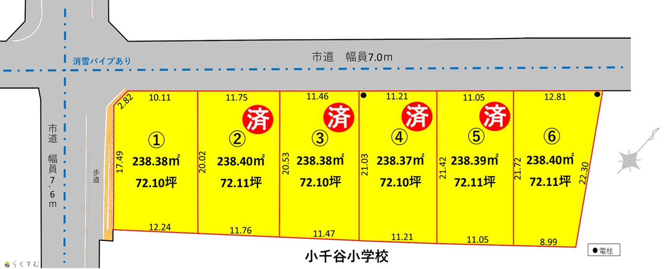| 備考 | ・購入者は土川7号線消雪組合に加入して頂きます。 ・確定測量後、面積、価格、寸法に変更が生じる場合があります。 ・電柱、支柱、支線のある区画は各5万円を価格から値引き致します。(設置区画に変更が生じる場合があります。) |