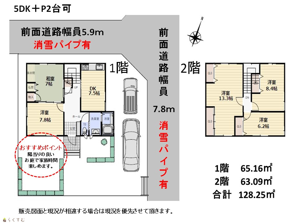 | 建物面積 | 1階 65.16㎡/ 2階 63.09㎡/ 計 128.25㎡ /38.79坪 | ||