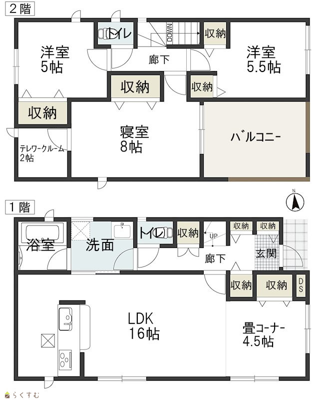 3LDK (洋室:8、5、5.5) LDK16 畳コーナー4.5 テレワークルーム2 |