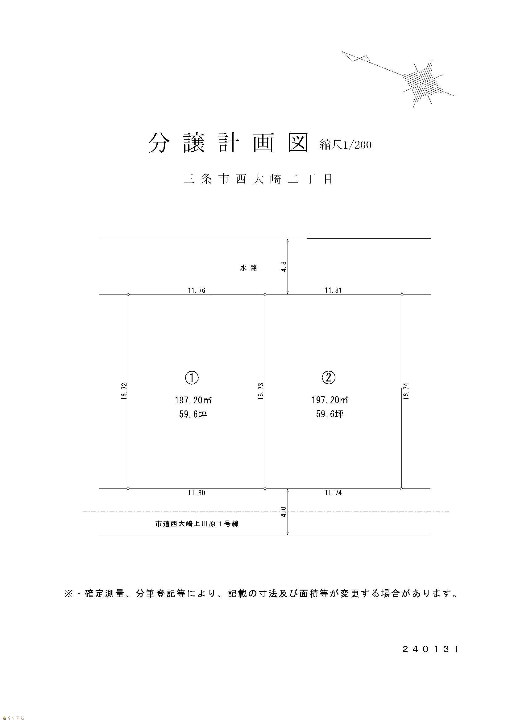 | 形状 | 間口 11.74m × 奥行 16.72m | 道路 | 南西:三条市道西大崎上川原1号線 幅員4.01m |