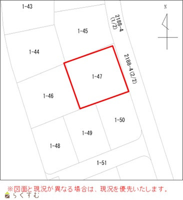 | 設備 | 整形地、前道6m以上、閑静な住宅街、建築条件なし、所有権、側溝、都市ガス(宅地内)、上水道(宅地内)、下水道(宅地内)、住宅向け、別荘地 | ||