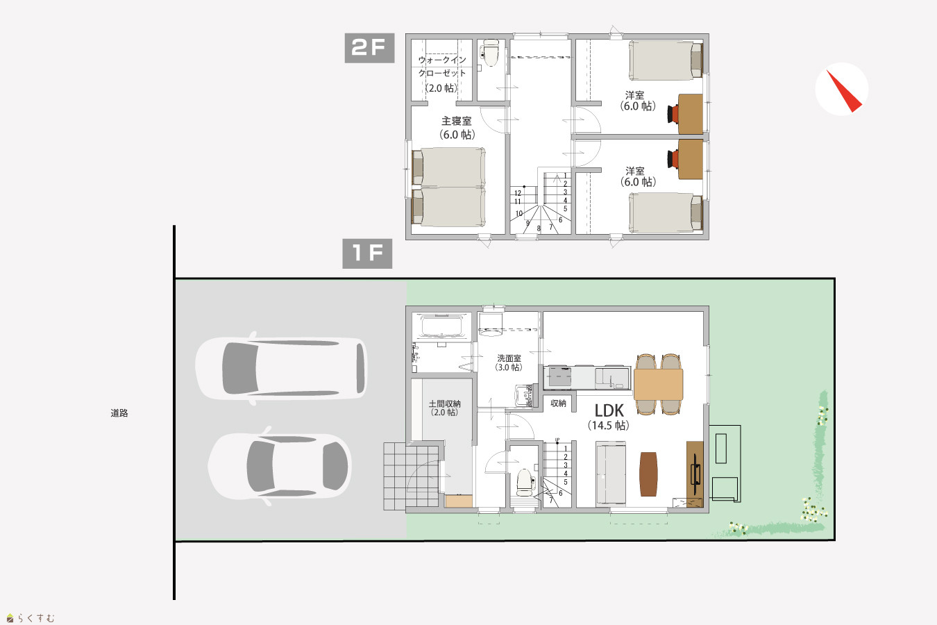3LDK (洋室:6、6、6) LDK14.5帖 洗面室3帖、土間収納2帖、WIC2帖 |