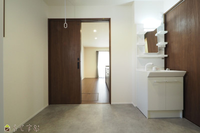 | 家事がしやすい家事楽動線!家族みんなが便利な間取りです♪3帖の洗面室はランドリースペースとして活用できます。洗う→干す→しまうができる家事楽洗面室です♪ | |||