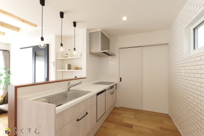 | 食器洗い乾燥機付きでお皿洗いも楽々!造作の洗面台で、オシャレな雰囲気!キッチンカウンター上ペンダントなど、オシャレな照明計画! | |||
