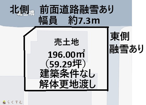 | 物件名 | 城岡三丁目 解体更地渡し 角地 前面道路融雪あり | ||