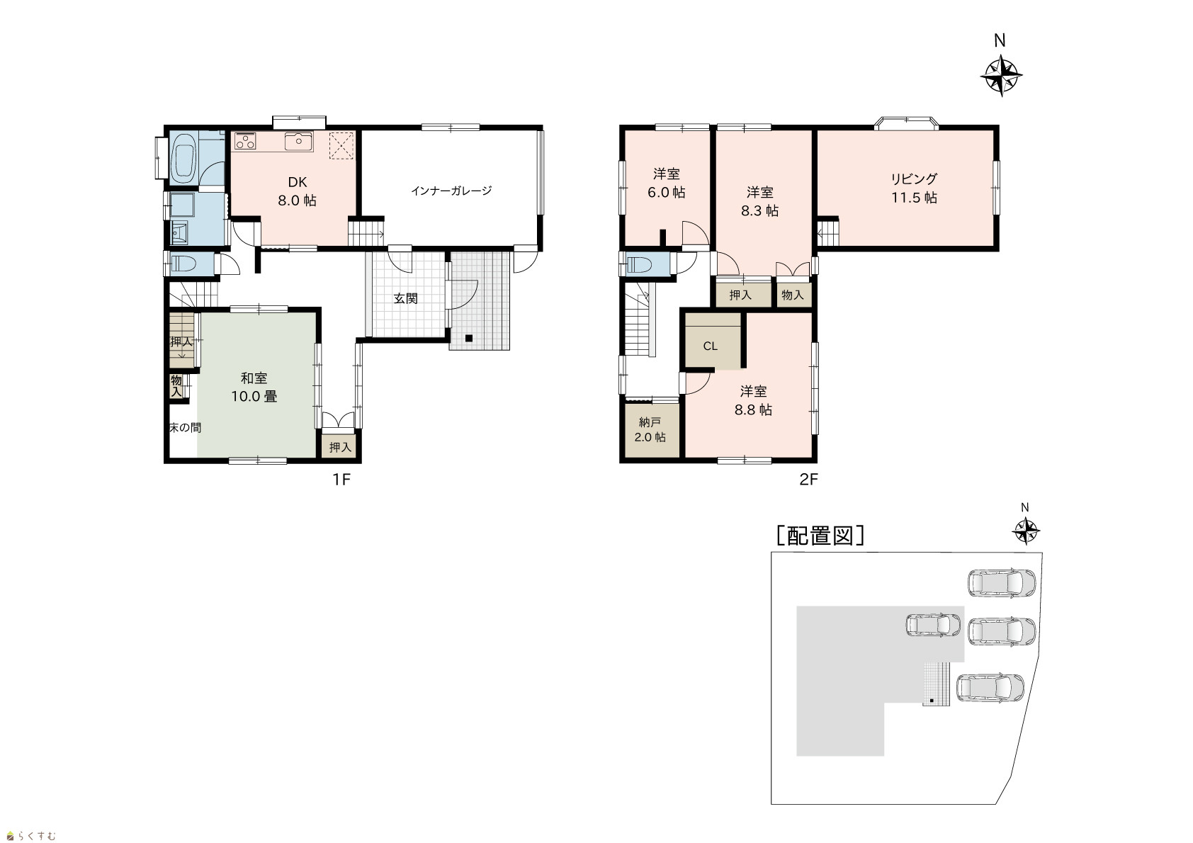 4LDK (和室:8.0畳) (洋室:11.5、8.8、8.3、6.0) LDK16.0 |