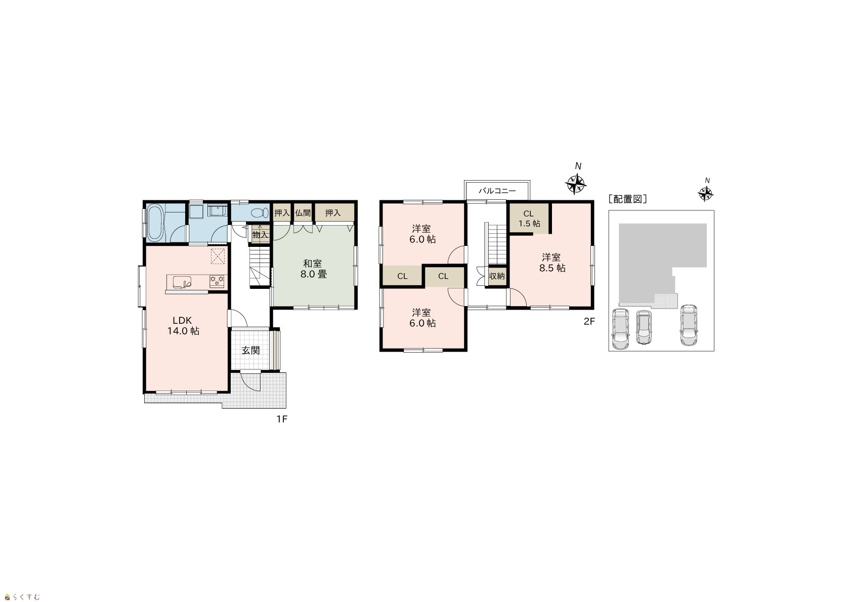 4LDK (和室:8.0畳) (洋室:8.5、6.0、6.0) LDK14.0 |