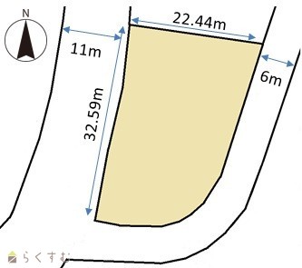 | 形状 | 間口 32.59m × 奥行 22.44m | 道路 | 西:県道(幅員11m)、東・南:村道(幅員6m) |