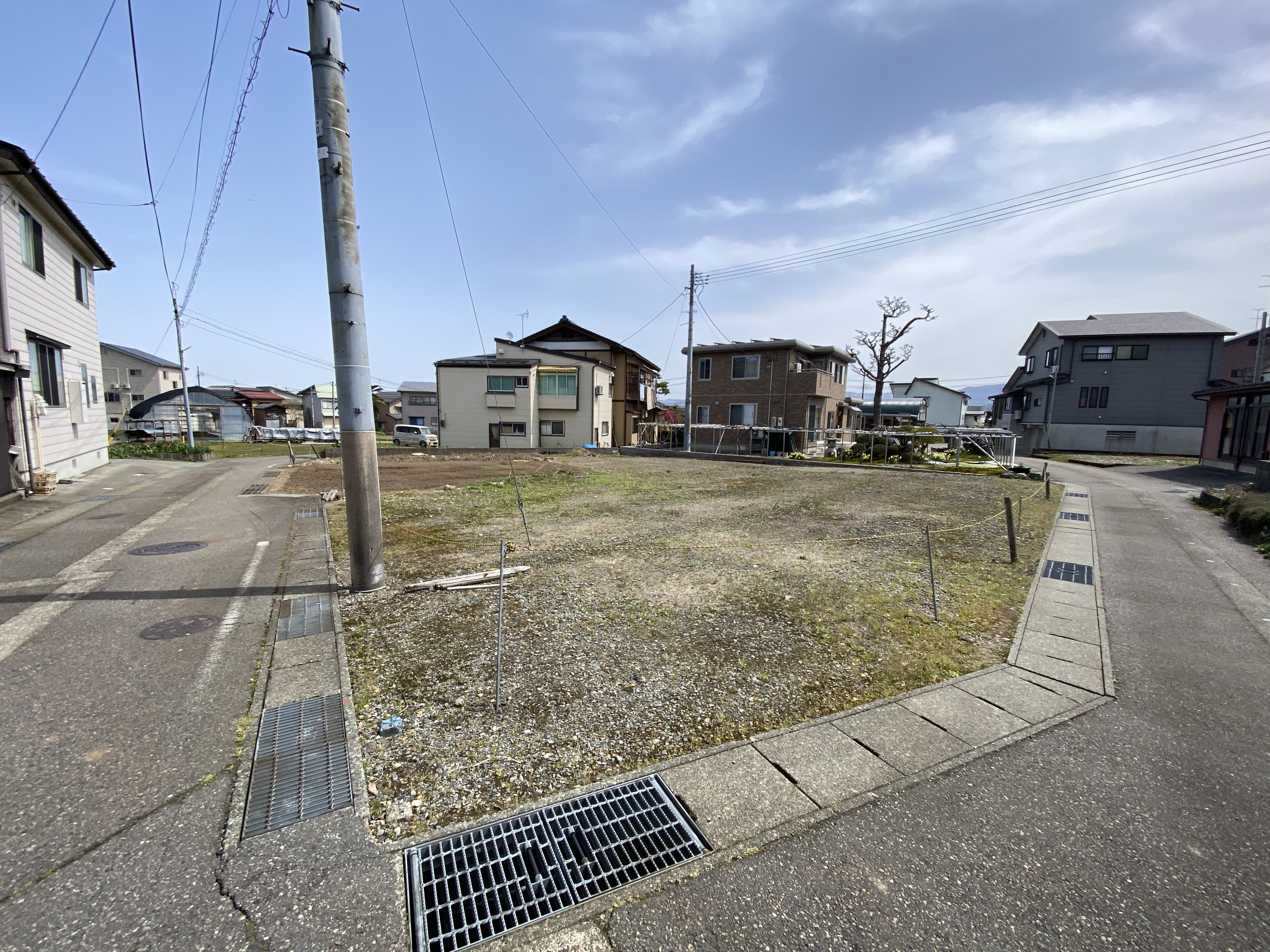 | 設備 | 角地、南側道路面す、更地、学校近く、閑静な住宅街、建築条件なし、所有権、側溝、電気、都市ガス(宅地内)、上水道(宅地内)、下水道(宅地内)、前面道路融雪設備あり、住宅向け、田舎暮らし | ||