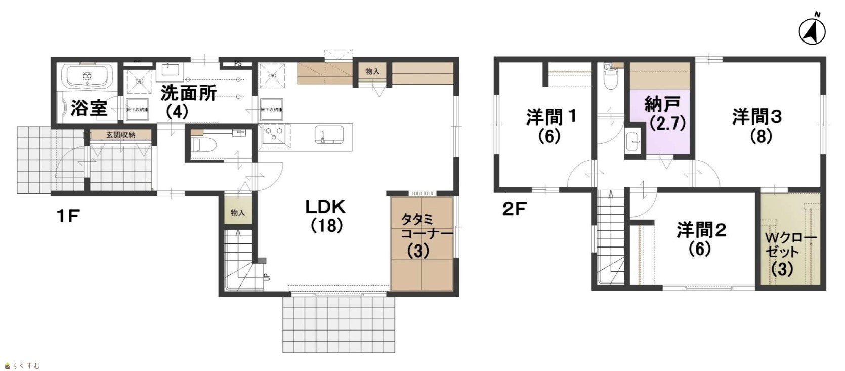3LDK (洋室:8、6、6) LDK18 タタミコーナー3帖、納戸2.7帖、WIC3帖 |