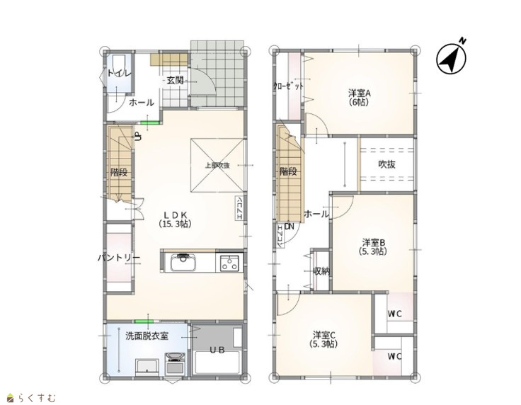 3LDK (洋室:6.0、5.3、5.3) LDK15.3 パントリー、ウォークインクローゼット2箇所有 |