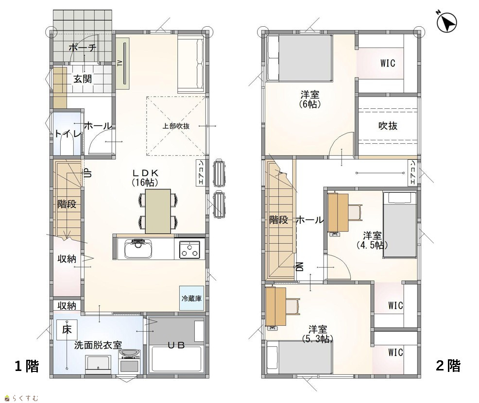 3LDK (洋室:6、5.3、4.5) LDK16 全居室にウォークインクローゼット有(3箇所) |