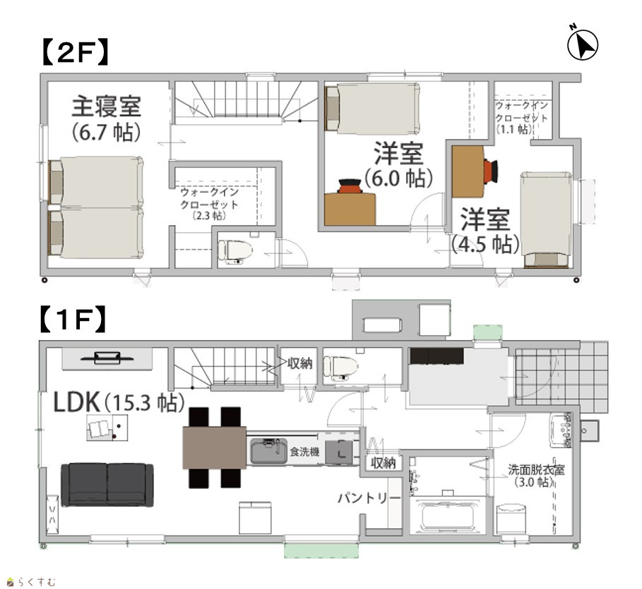 | 2箇所のWICやリビング収納、パントリーなど収納充実♪コンパクトながらも住空間を充分に確保できる間取りです。1階の洗面脱衣室で室内干しもできるので天候に左右されず安心です◎ | |||