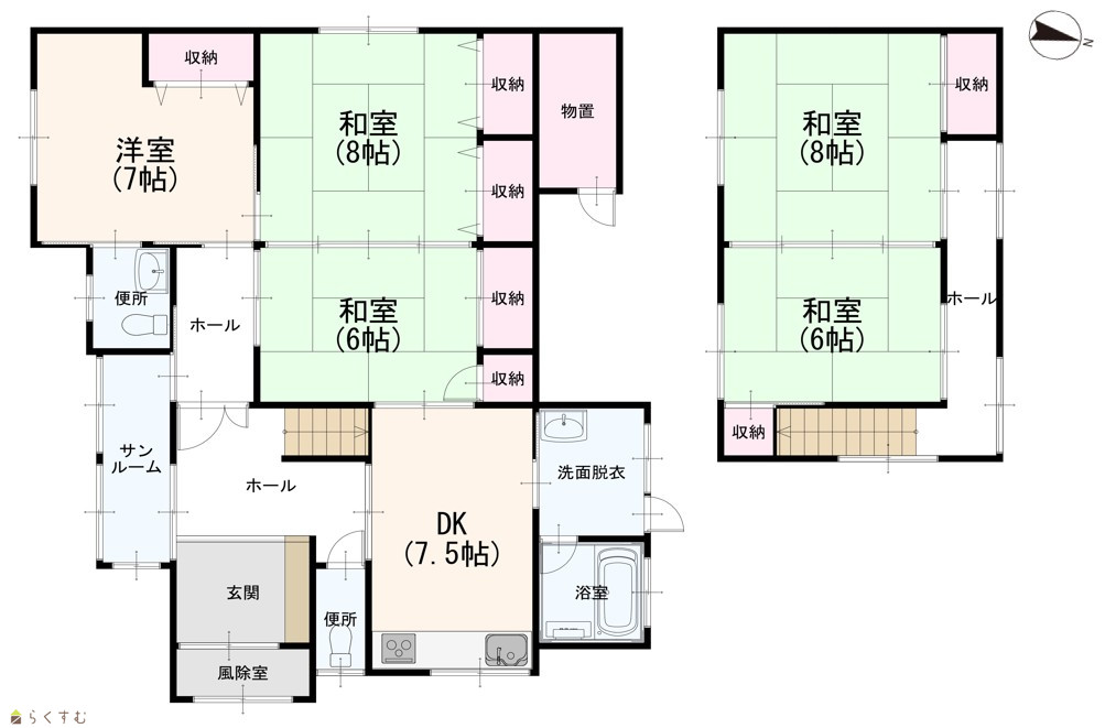 5DK (和室:8畳、8畳、6畳、6畳) (洋室:7) DK7.5 1階:サンルーム・物置あり |