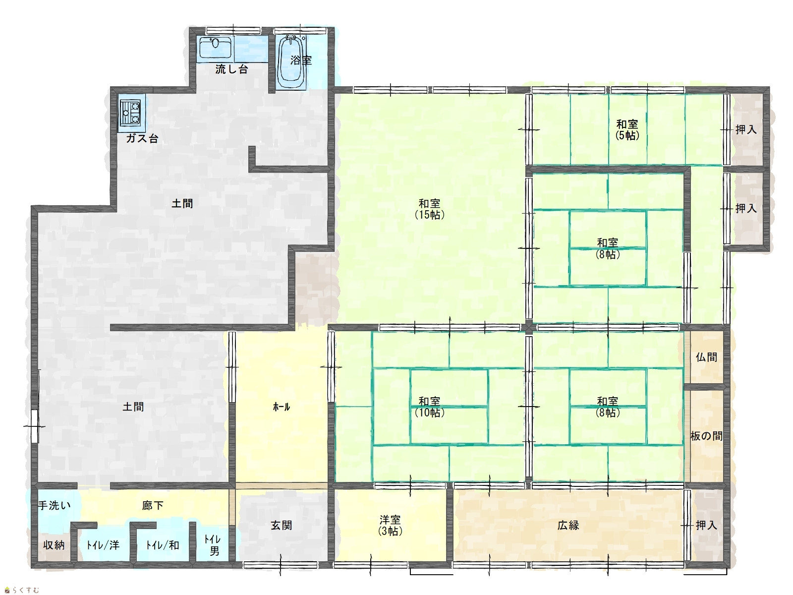 | 間取り | 5K (和室:15畳、10畳、8畳、8畳、5畳) | ||