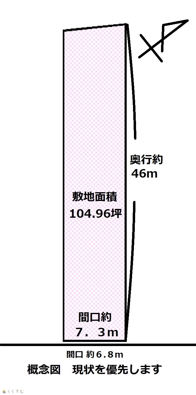| 形状 | 間口 7.3m × 奥行 46.5m | 道路 | 南西側約6.8ⅿ |