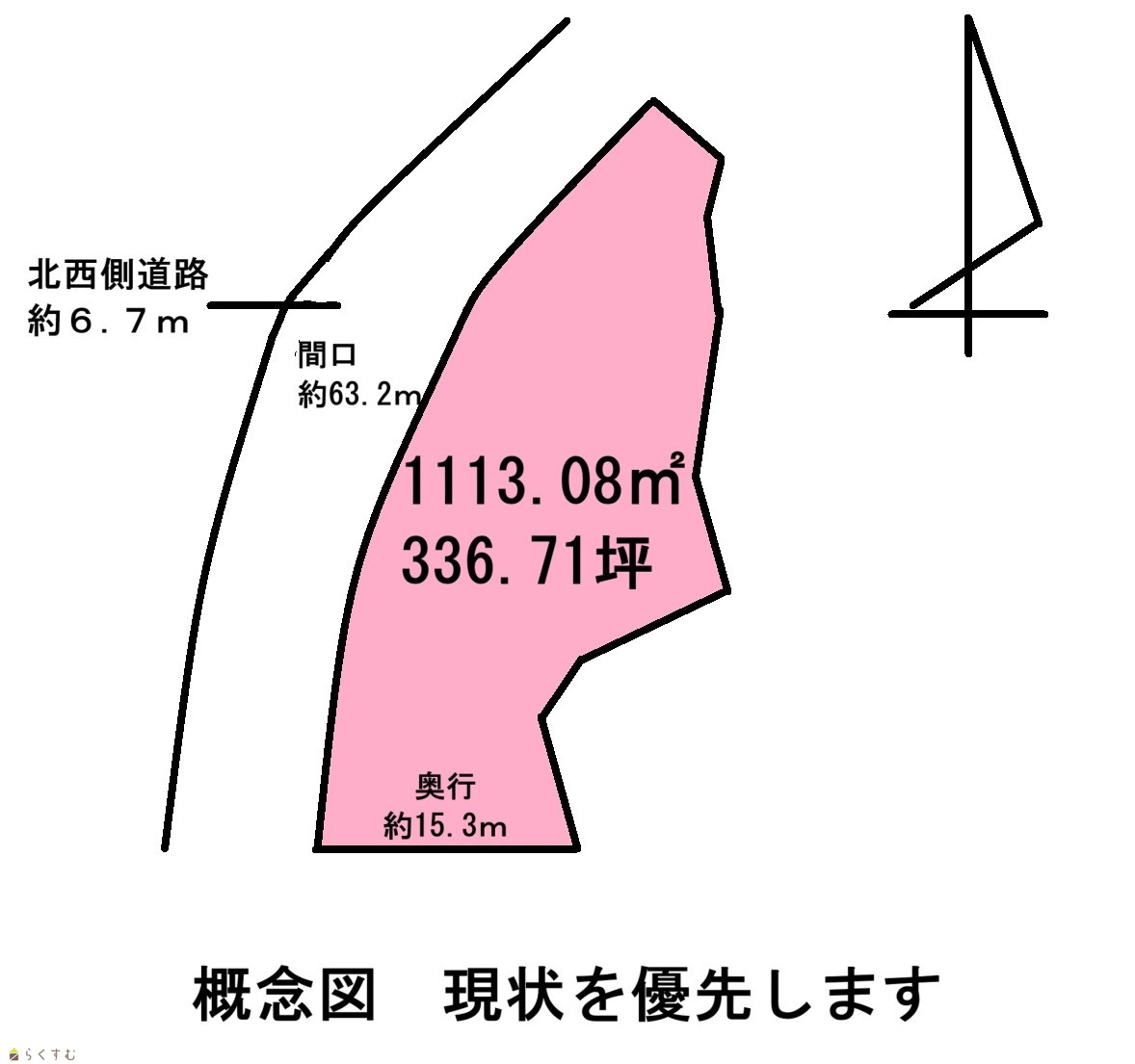 | 形状 | 間口 63.2m × 奥行 15.3m | 道路 | 北西側約6.7m |