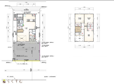 | ご家族やお客様との会話も楽しめる対面キッチン。 二階ホールに物干しスペースあり。 リビング17畳、家族が自然に集まる広さ。 ウォークインクローゼット等収納豊富。 出し入れしやすい駐車場(2台可)。 前面道路が広く(6m)、間口もゆったり(8m) | |||