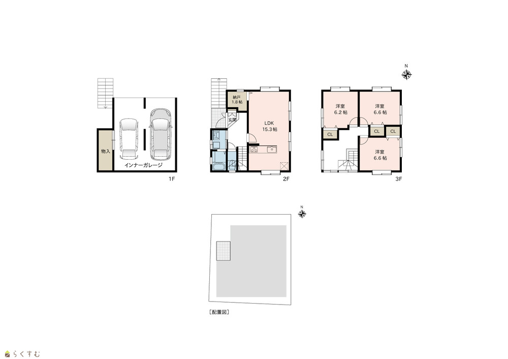 | 一階には2台分のインナーガレージと、タイヤやカー用品を収納できる物入が設けられています。2階は15.3帖のLDKで、家族との会話が弾む対面キッチンと1.8帖の納戸付きリビングがあります。3階には全居室収納付きの3部屋を配置し、ホールにはホスクリーン付きスペースを設け、雨天時でも安心して洗濯物を干せます。 | |||