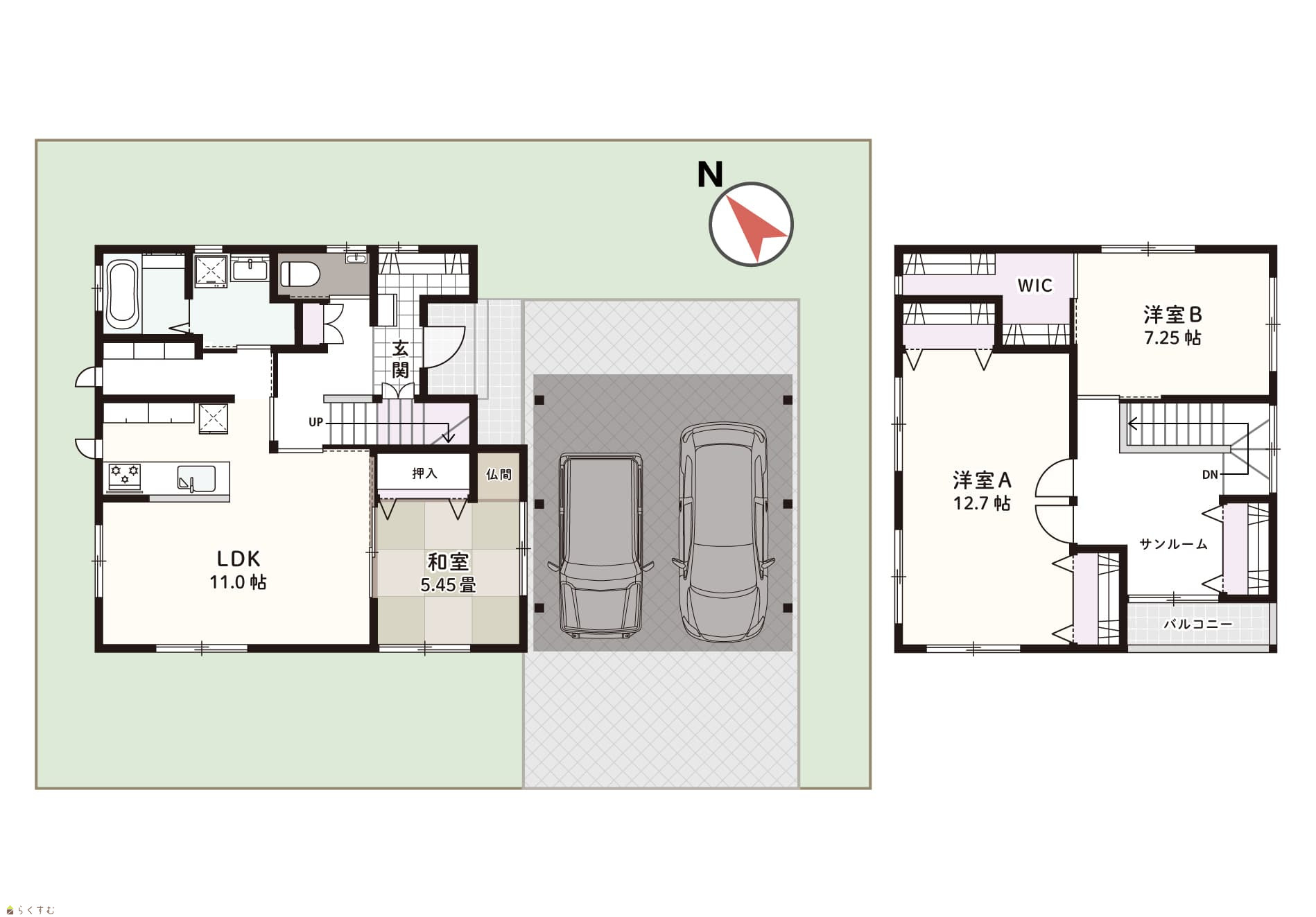 3LDK (和室:5.4畳) (洋室:12.7、7.2) LDK15.4 |