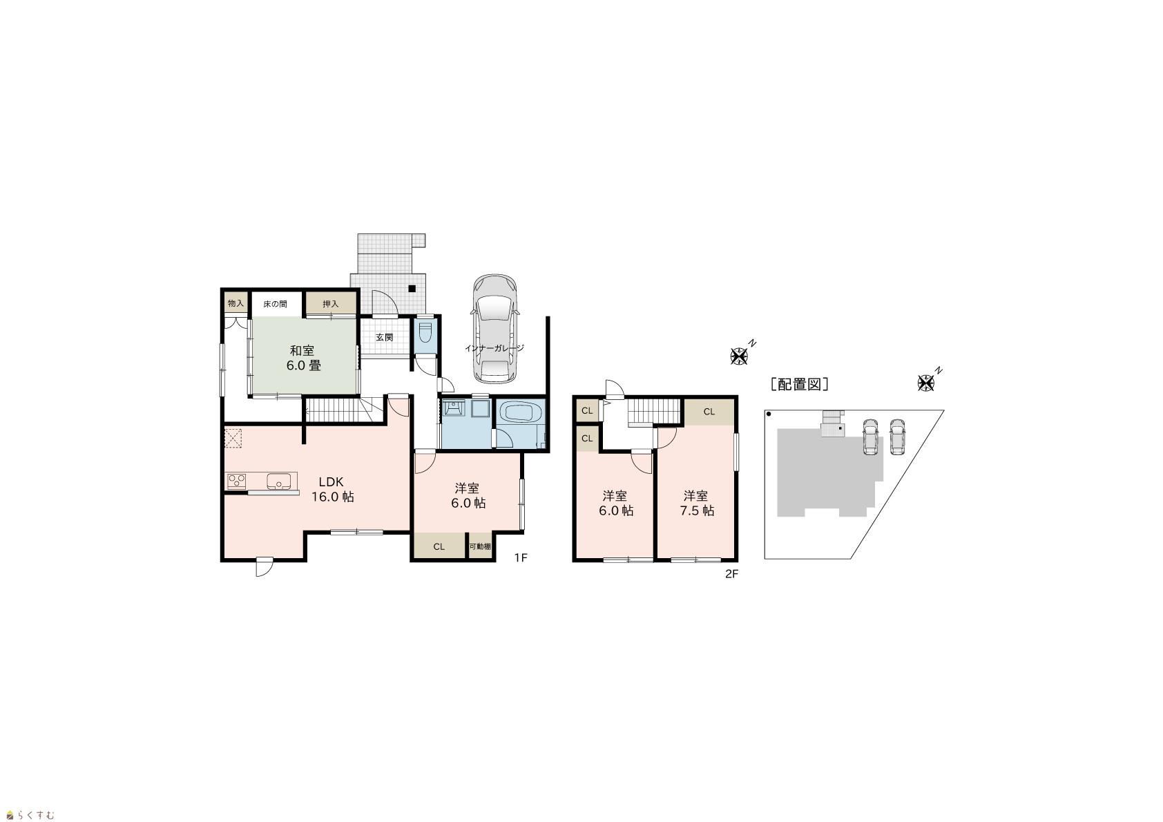 4LDK (和室:6.0畳) (洋室:7.5、6.0、6.0) LDK16.0 |