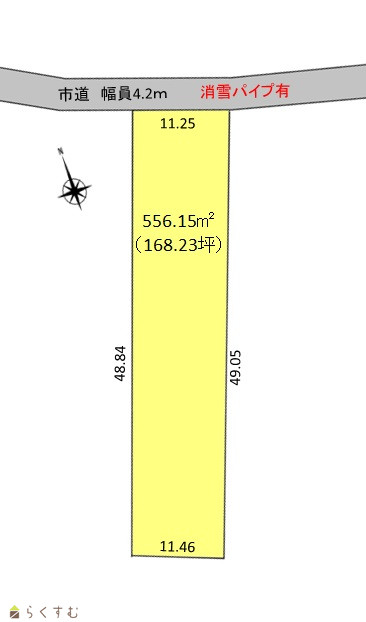 | 形状 | 間口 11.25m × 奥行 48.84m | 道路 | 市道 幅員4.2m 消雪パイプあり |