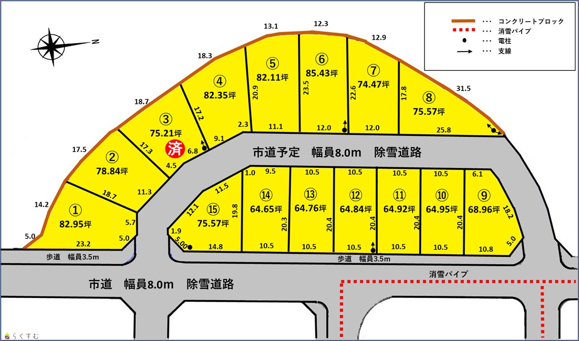 | 備考 | ・地目は宅地に変更予定です。 ・確定測量後、面積、価格、寸法に変更が生じる場合があります。 ・消雪組合が設立した場合には消雪工事負担金が別途必要になる場合があります。 ・電柱、支柱、支線のある区画は各5万円を価格から値引き致します。(設置区画に変更が生じる場合があります。) \おすすめポイント/ ①ゆとりある広々敷地に思い描いた住宅を現実に。 ②広大な遊び場、癒しの庭園が魅力の越後丘陵公園まで車で3分。 ③大積スマートインター開設で高速道路の利用が便利になります。 ④ひらせい生鮮食品、ホームセンターまで車で5分と生活利便性良好です。 ⑤前面道路は幅員8mと広々消雪パイプ設置も検討中です。 |