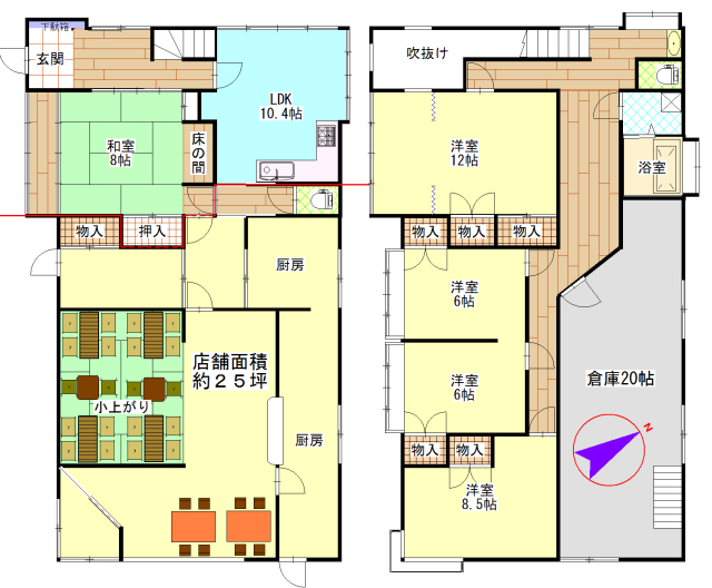 5LDK (和室:8畳) (洋室:12、8.5、6、6) LDK10.4 2階倉庫20畳有 |