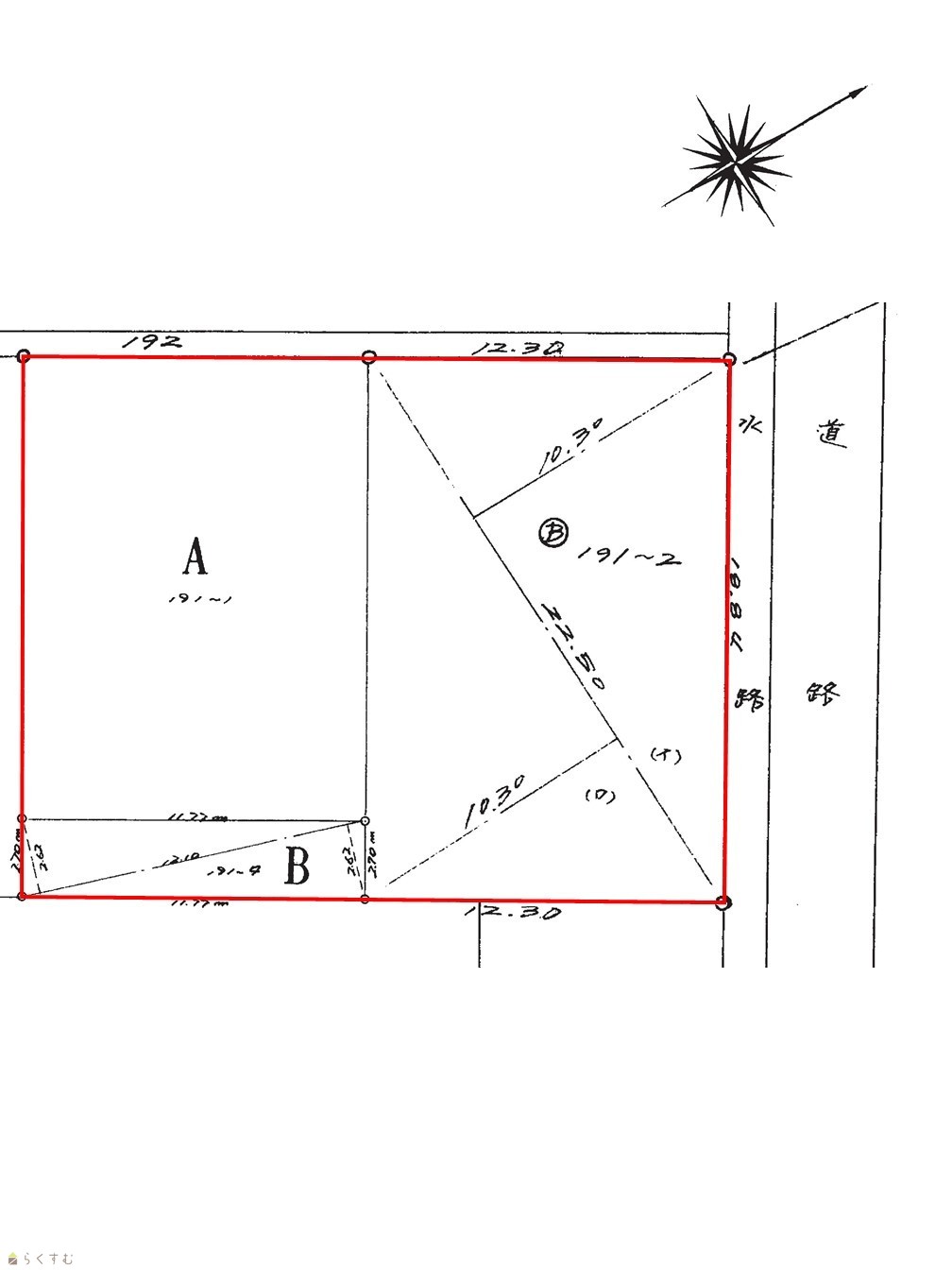 | 形状 | 間口 18.84m × 奥行 24.07m | 道路 | 北東側 市道 幅員約5.0m |