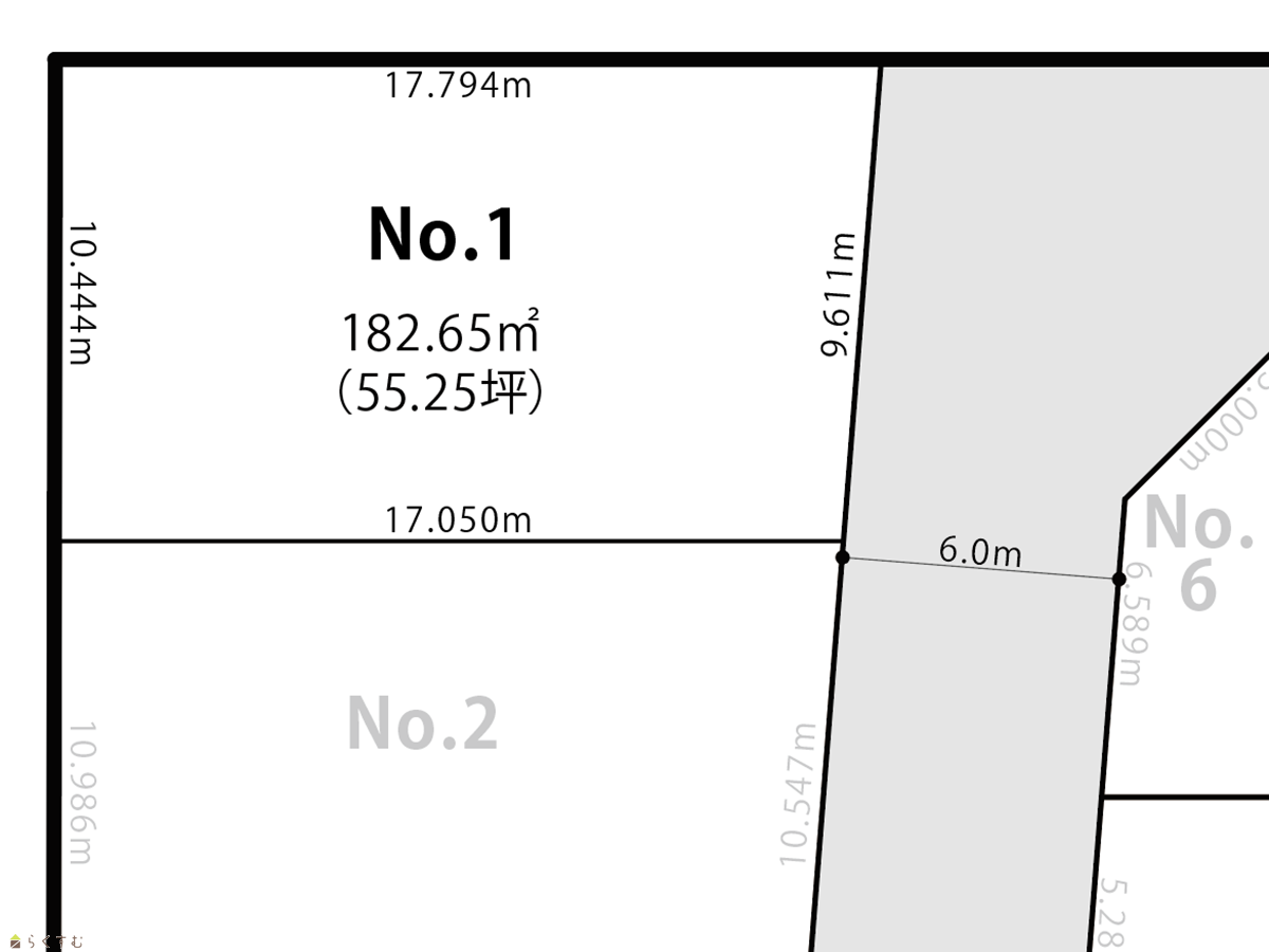 | 設備 | 角地、整形地、前道6m以上、南側道路面す、更地、スーパー近く、閑静な住宅街、建築条件なし、所有権、側溝、電気、都市ガス(宅地内)、上水道(宅地内)、下水道(宅地内)、住宅向け | ||