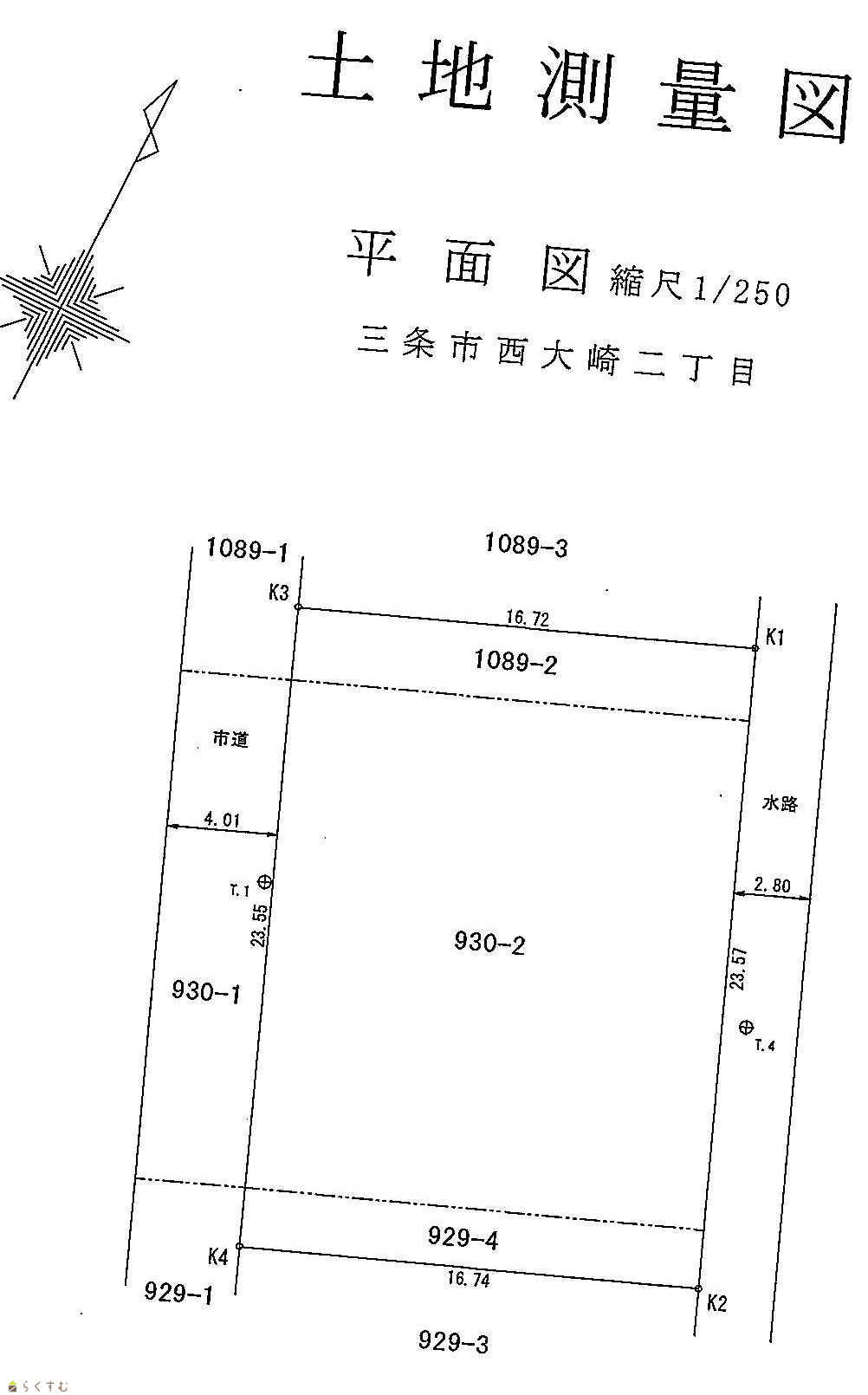 | 形状 | 間口 23.55m × 奥行 16.72m | 道路 | 南西:三条市道西大崎上川原1号線 幅員4.01m |