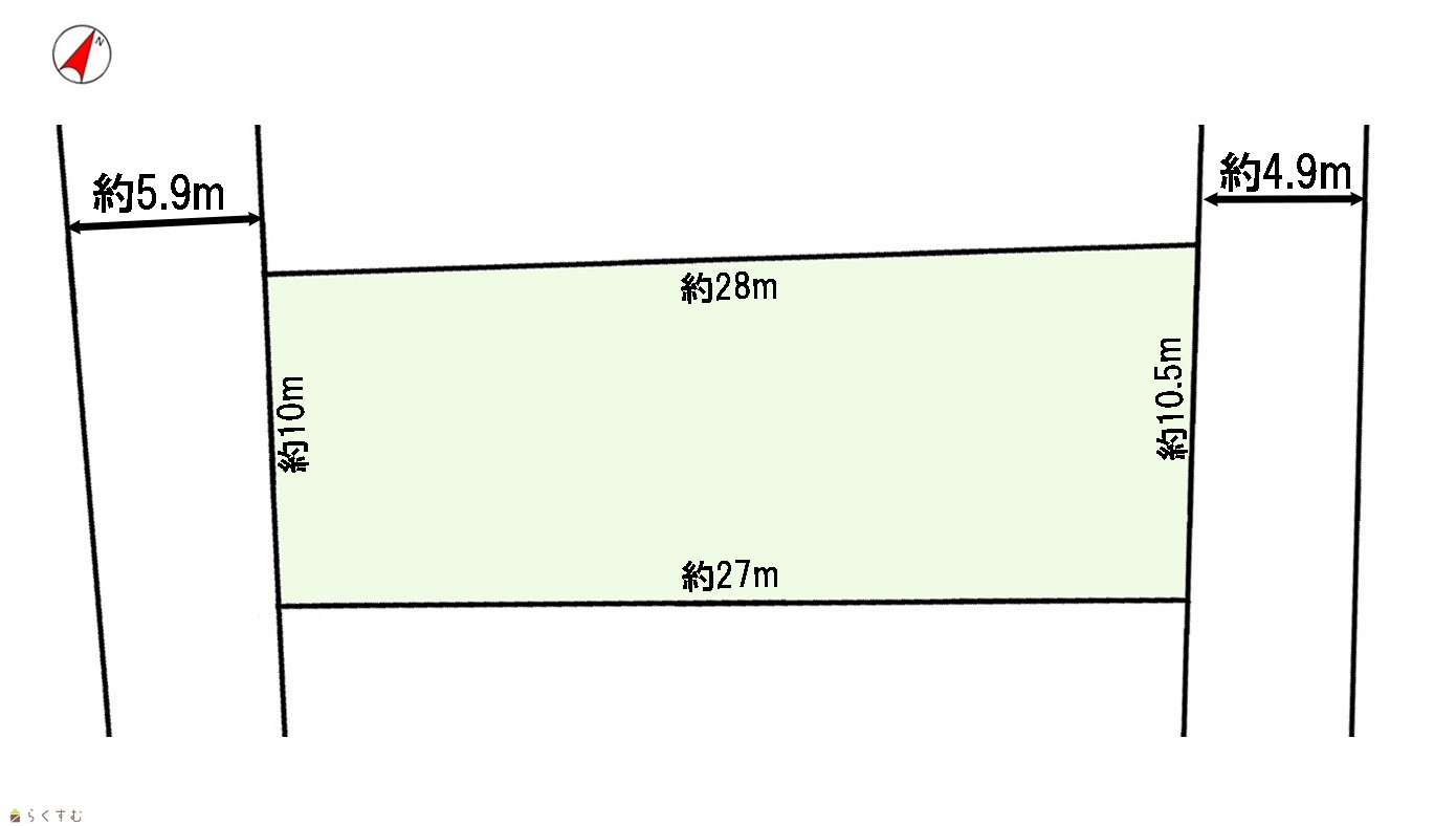 | 形状 | 間口 10m × 奥行 27m | 道路 | 西側:幅員約5.9m・東側:幅員約4.9m |
