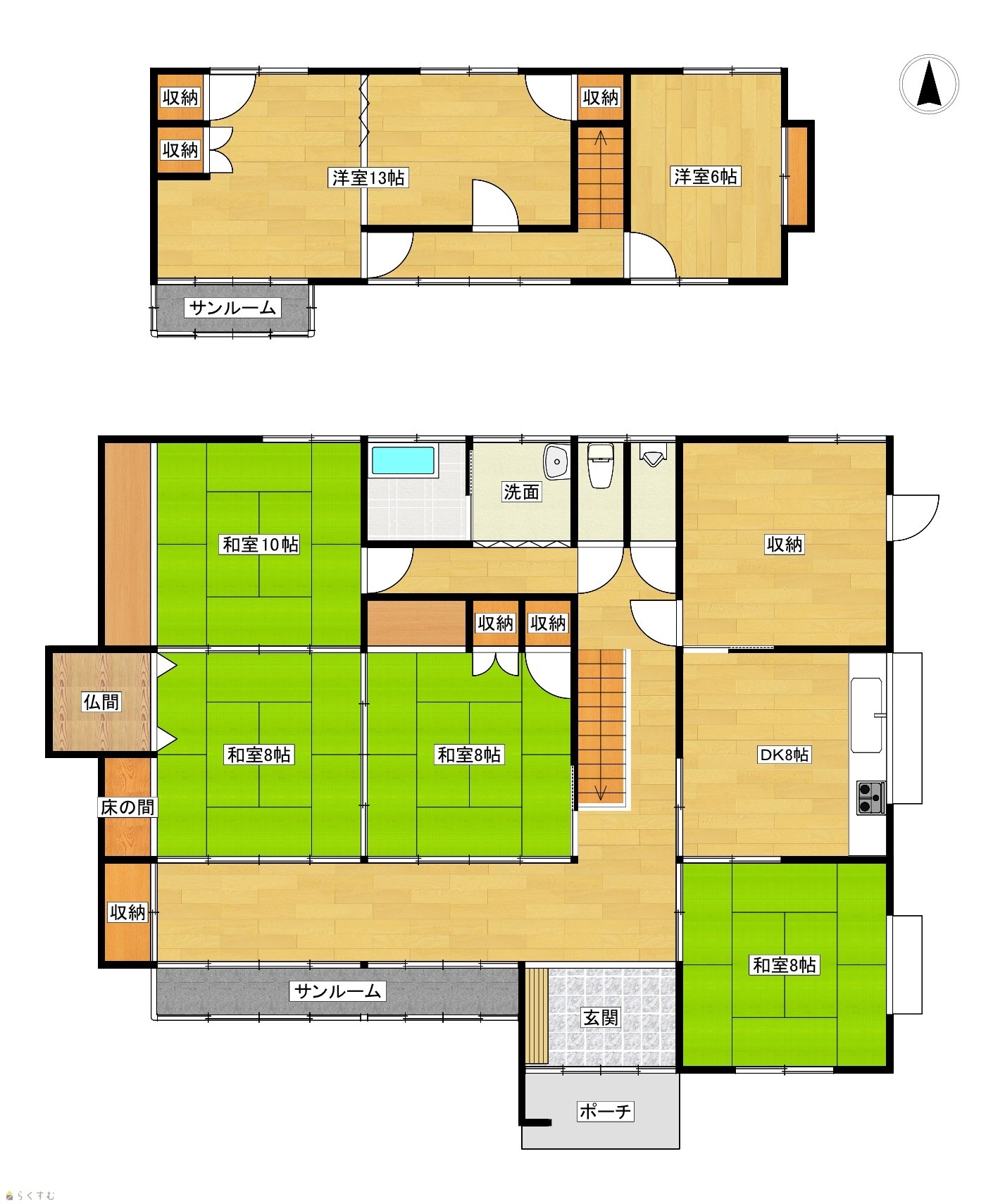 6DK (和室:10畳、8畳、8畳、8畳) (洋室:13、6) DK8 別途2台駐車可能な車庫とお庭に離れがあります |