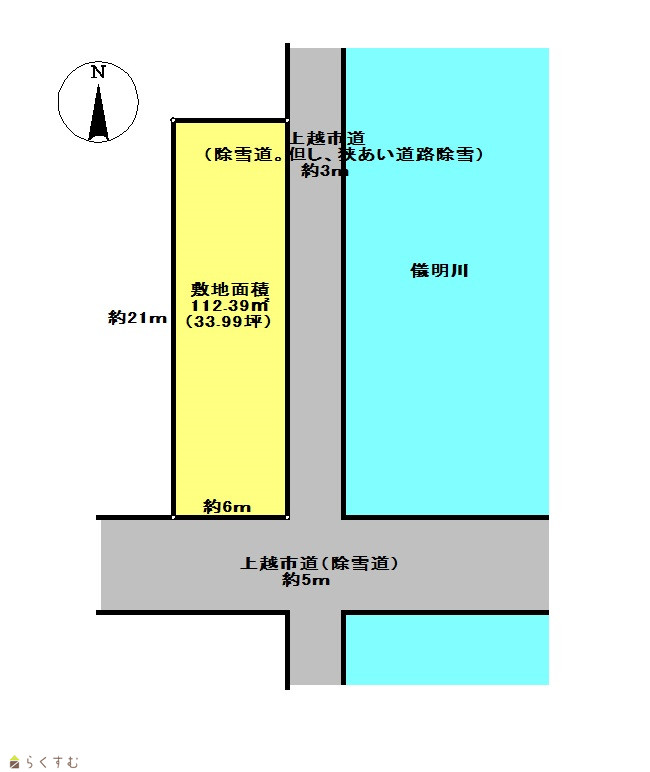 | 形状 | 間口 6m × 奥行 21m | 道路 | 南側:市道(除雪道)、約5m 東側:市道(除雪道)、約3m |