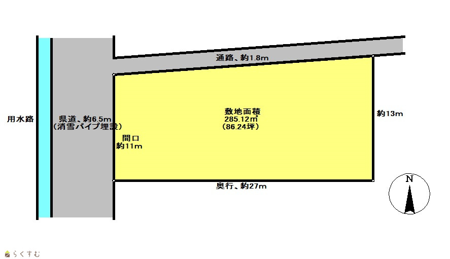 | 形状 | 間口 11m × 奥行 27m | 道路 | 西側:県道(消雪パイプ埋設)、約6.5m |