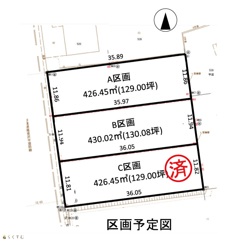 | 備考 | ・販売区画数:3(1区画は済み)平地区地区計画C地区内となります。 ・農地法第5条の許可申請が必要となります。 |