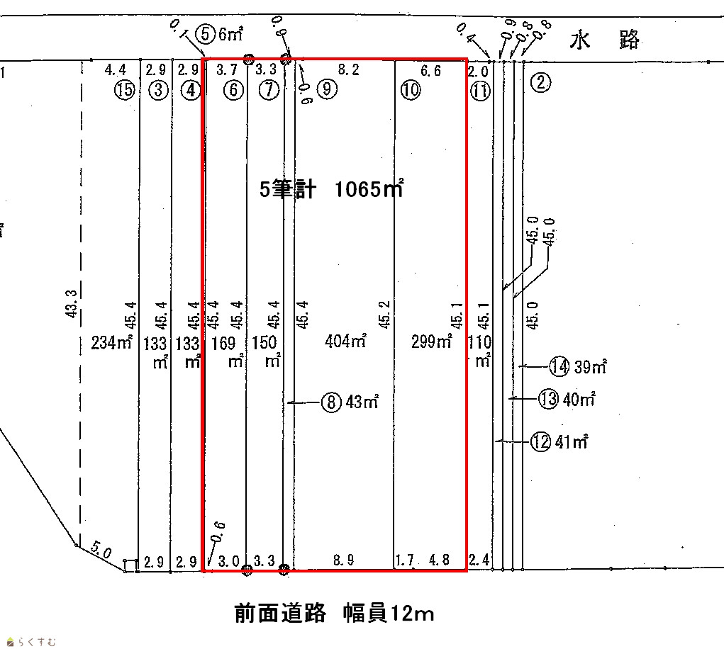 | 形状 | 間口 23.3m × 奥行 45.1m | 道路 | 県道山田中潟線 幅員12m |